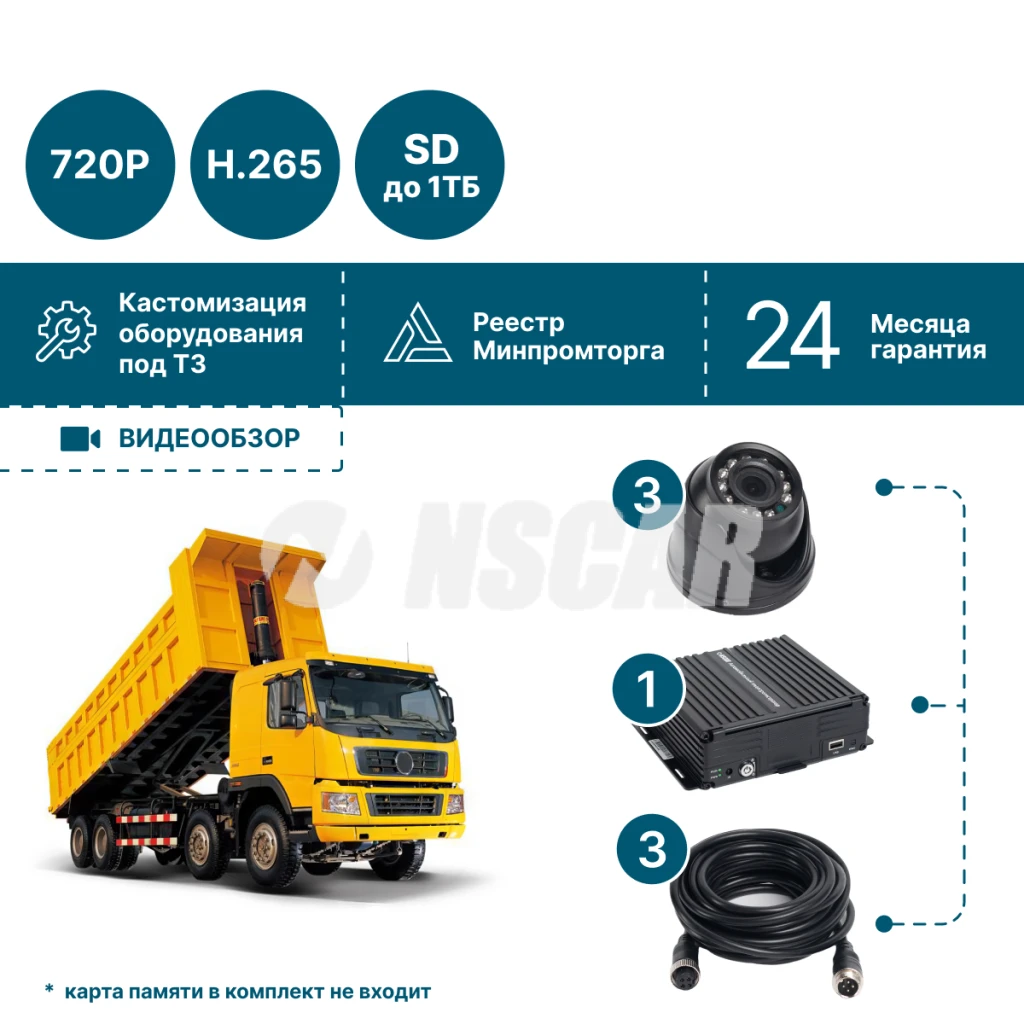 Комплект NSCAR GT301_HDD с 3 HD-камерами и записью на HDD до 2 ТБ — надежное решение для видеонаблюдения в грузовом транспорте.